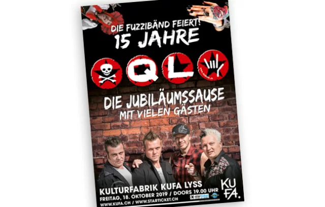 Am Freitag, 18. Oktober 2019 feiert QL, die lauteste Schweizer Mundart-Band ihr 15-jähriges Band-Jubiläum in der KUFA Lyss. «Gott sei Punk» mit einem Schluck Bier und ein, zwei Gästen…