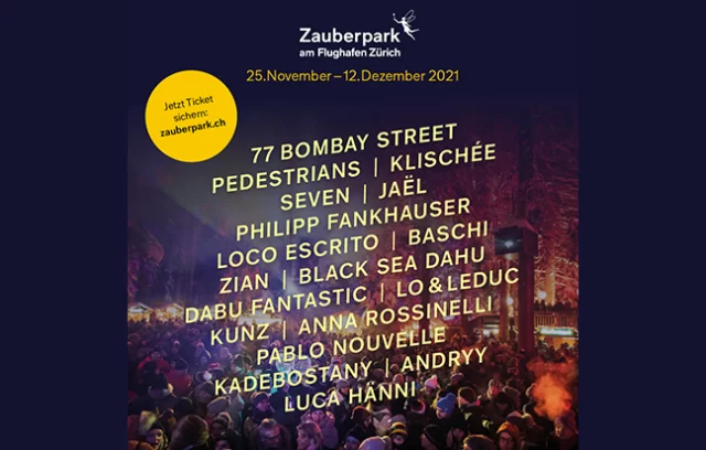 Während 18 Tagen (Donnerstag, 25. November - Sonntag, 12. Dezember 2021) verwandelt sich der Flughafenpark im Circle in eine magische Welt und bietet zauberhafte Erlebnisse: Täglich begrüssen die Organisatoren Top-Stars aus der Schweizer Musikszene sowie Kinder Acts auf der grossen Bühne, Lichtinstallationen entlang des Panoramawegs warten darauf von Euch entdeckt zu werden und leckere Köstlichkeiten sowie wärmende Getränke sorgen für Euer Wohl. Der Zauberpark 2021 freut sich auf Deinen Besuch!