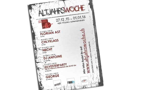 Nur noch wenige Tage und die Altjahrswoche 2015 startet mit ihrem erneut tollen Programm in die neue Runde. In diesen letzten Tagen des Jahres wird in Schwarzenburg nochmals so richtig die Party steigen, gemeinsam mit vielen Schweizer Top-Acts wie Florian Ast, Hecht, DJ Antoine und mehr!