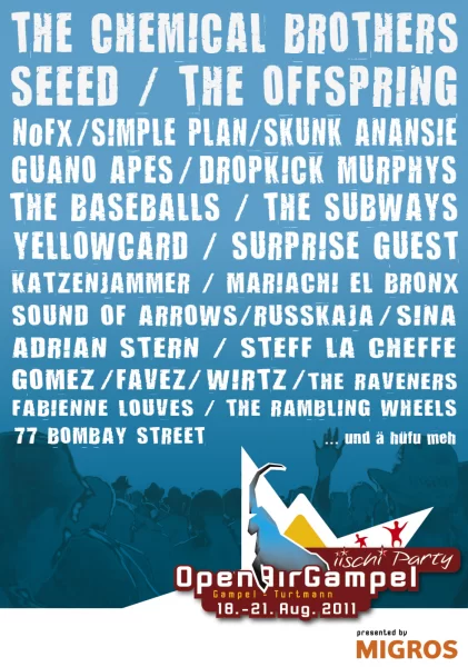 Das weitere Line-up präsentiert sich nicht minder hitverdächtig: Punk/Rock mit NoFX, Simple Plan, Skunk Anansie, Guano Apes und Yellowcard. Ganz eigene Musikstile versprechen die Verpflichtungen von The Baseballs, Dropkick Murphys, Mariachi El Bronx, Russkaja und Sound of Arrows. Daneben überrascht ‚Gampel’ mit viel Musik aus der Schweiz: Sina, Adrian Stern und Favez. Noch ist das Programm nicht komplett; während Donnerstag und Samstag praktisch vollständig sind, fehlen an den anderen Festivaltagen noch einige Bands; u.a. auch zwei Co-Headliner.
