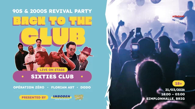 Am Samstag, 21. März 2026, verwandelt sich die Simplonhalle in Brig für "Back to the Club" in den ultimativen Party-Hotspot. Der legendäre Sixties Club bringt für dieses exklusive Kult-Comeback ein sensationelles Line-up auf die Bühne: Als Special Guests sind niemand Geringeres als Dodo, Operation Zero und Florian Ast mit dabei!